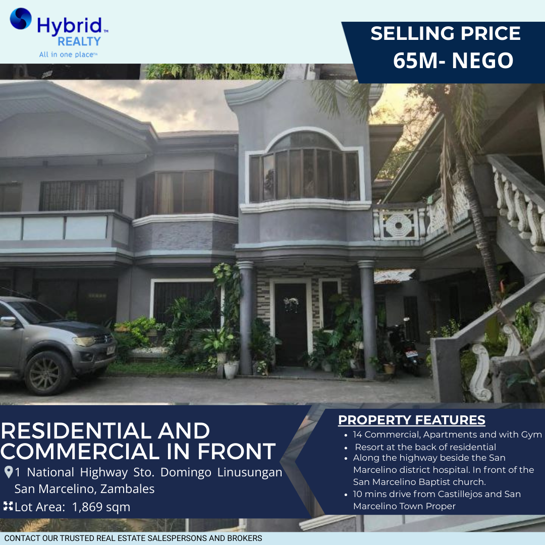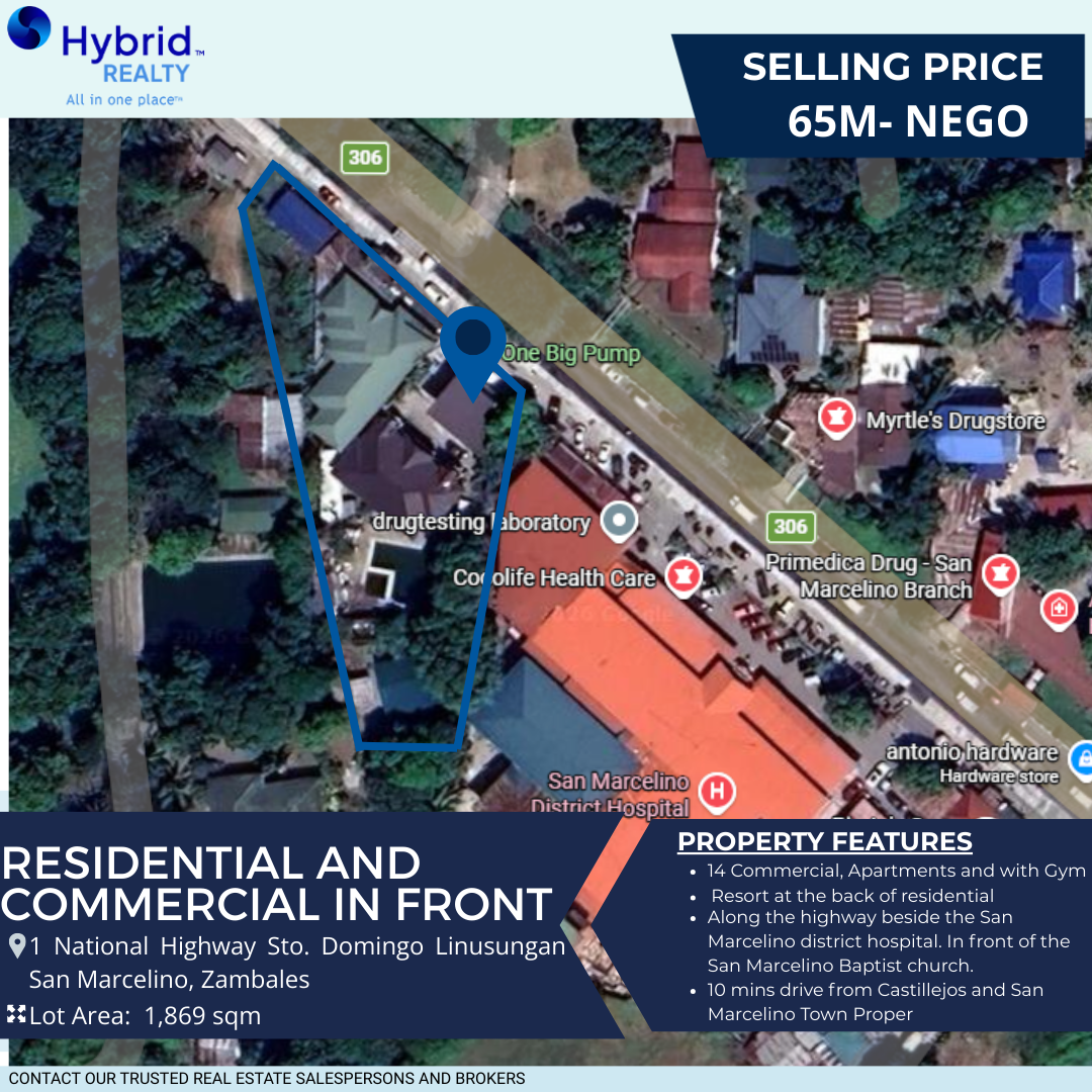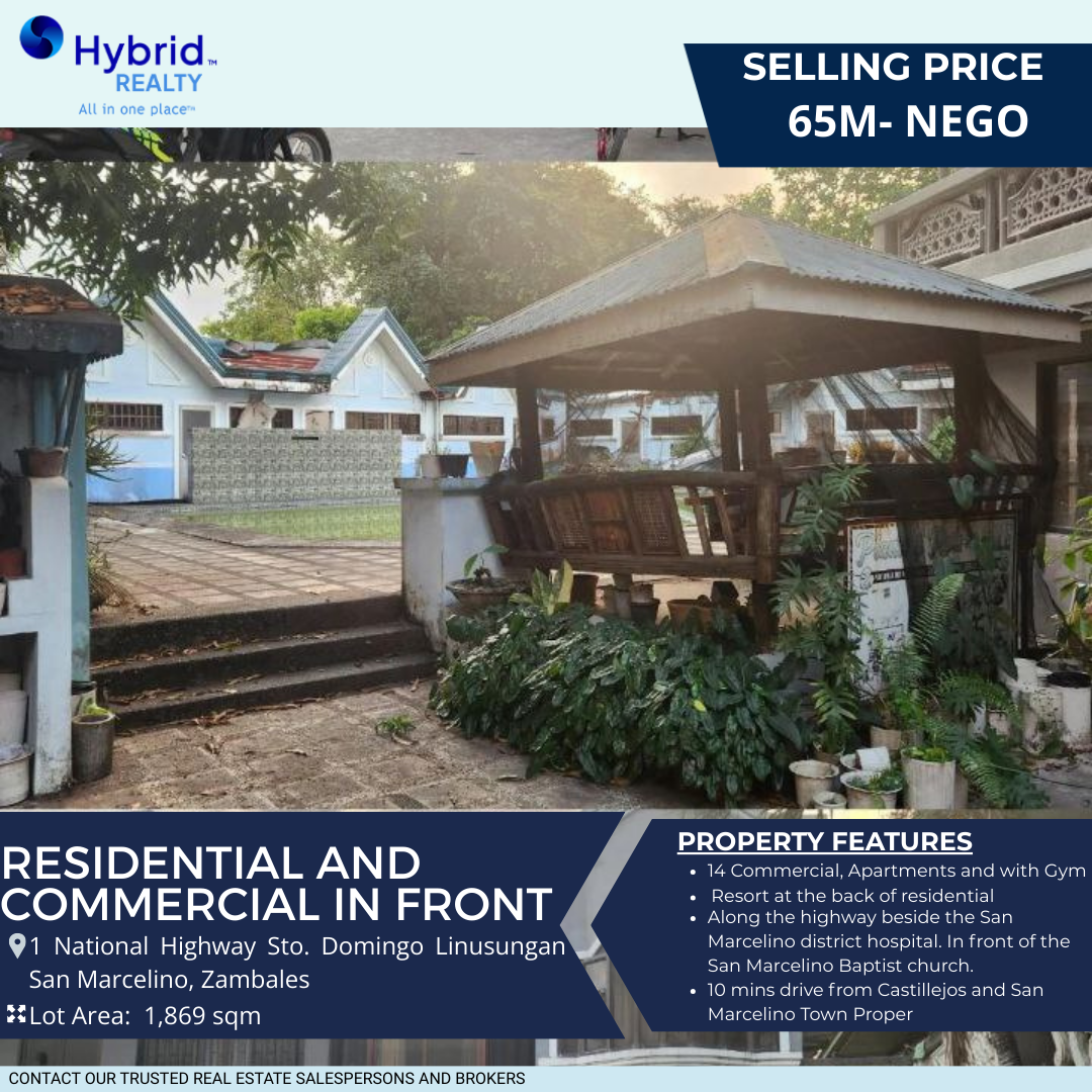 A 1,869 sqm mixed-use property located along the National Highway in Sto. Domingo, Linusungan, San Marcelino, Zambales. The property is currently income-generating and features commercial units, apartment spaces, a gym facility, and a resort area at the rear portion. Ideal for investors seeking steady rental income and long-term property value growth.